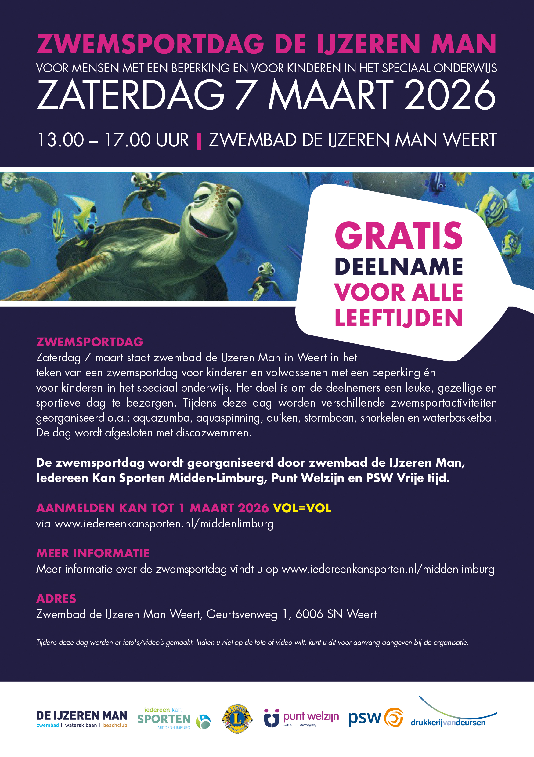 Zaterdag 7 maart is er weer de regionale Zwemsportdag bij Zwembad de IJzeren Man in Weert! De zwemsportdag is speciaal voor kinderen en volwassenen met een speciale behoefte/beperking en hun begeleiding. De toegang is (na aanmelding) gratis.